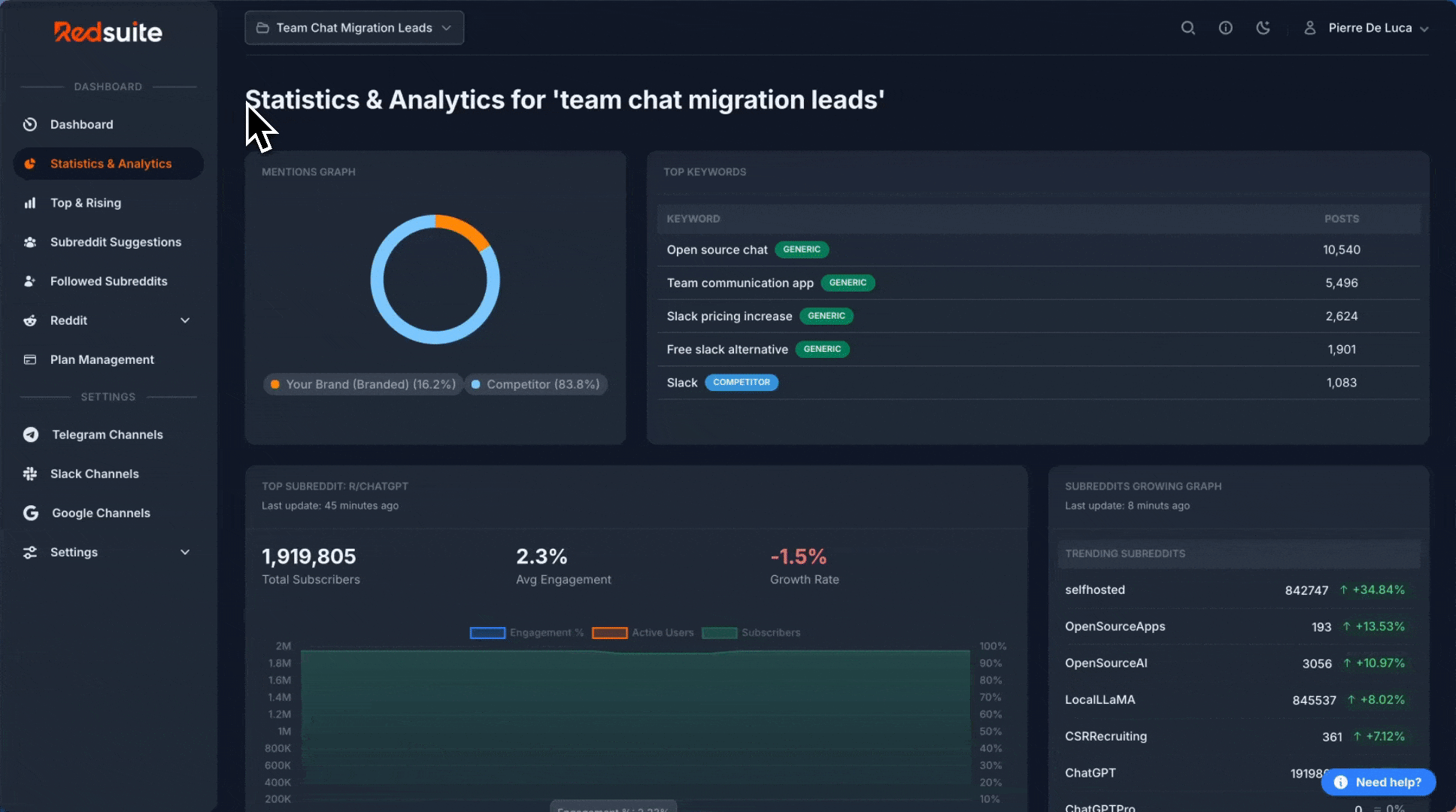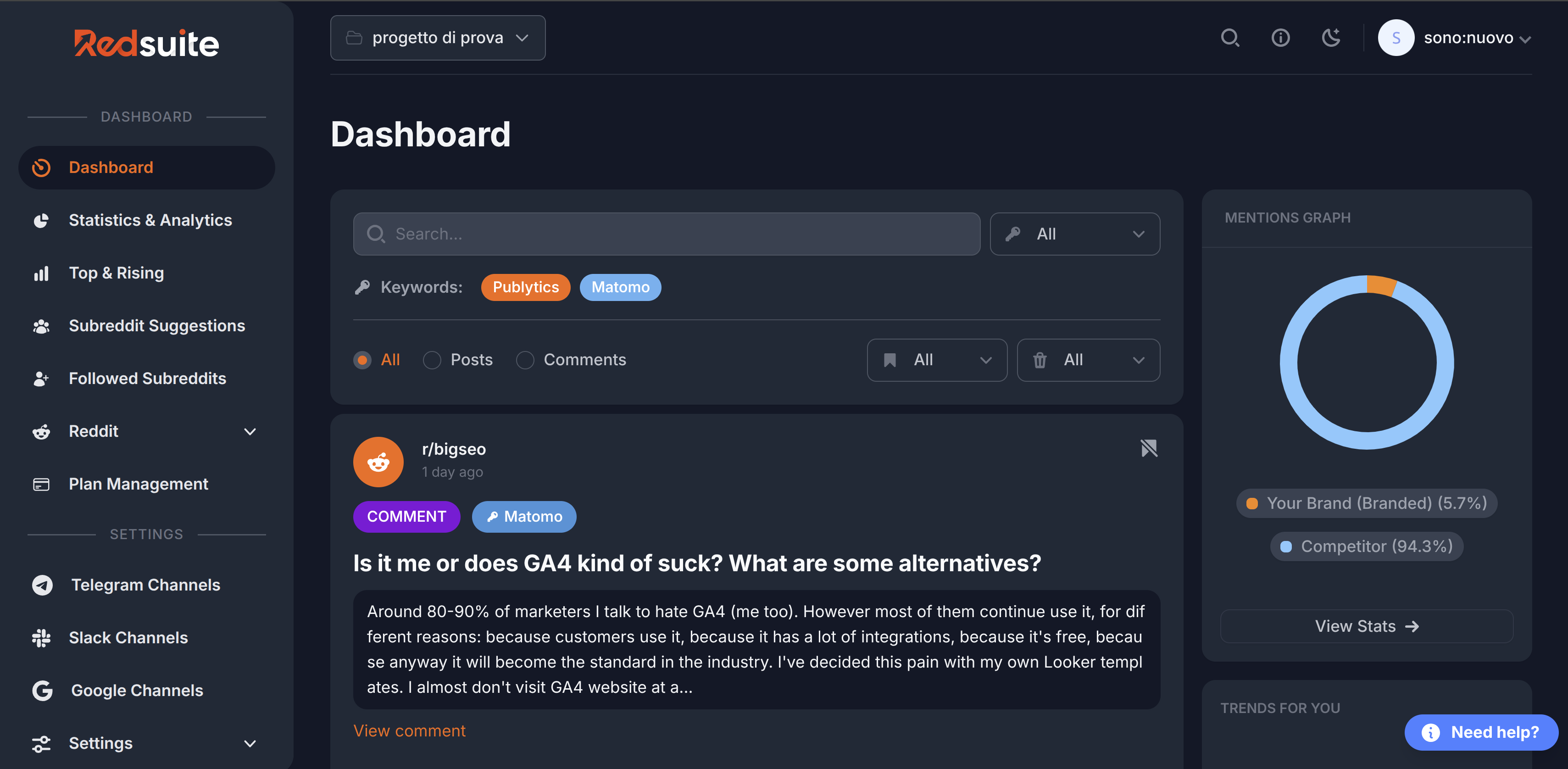 RedSuite brings everything you need into a single dashboard. Monitor keyword mentions, track top posts, and jump directly into relevant conversations to connect with users who are ready to listen.